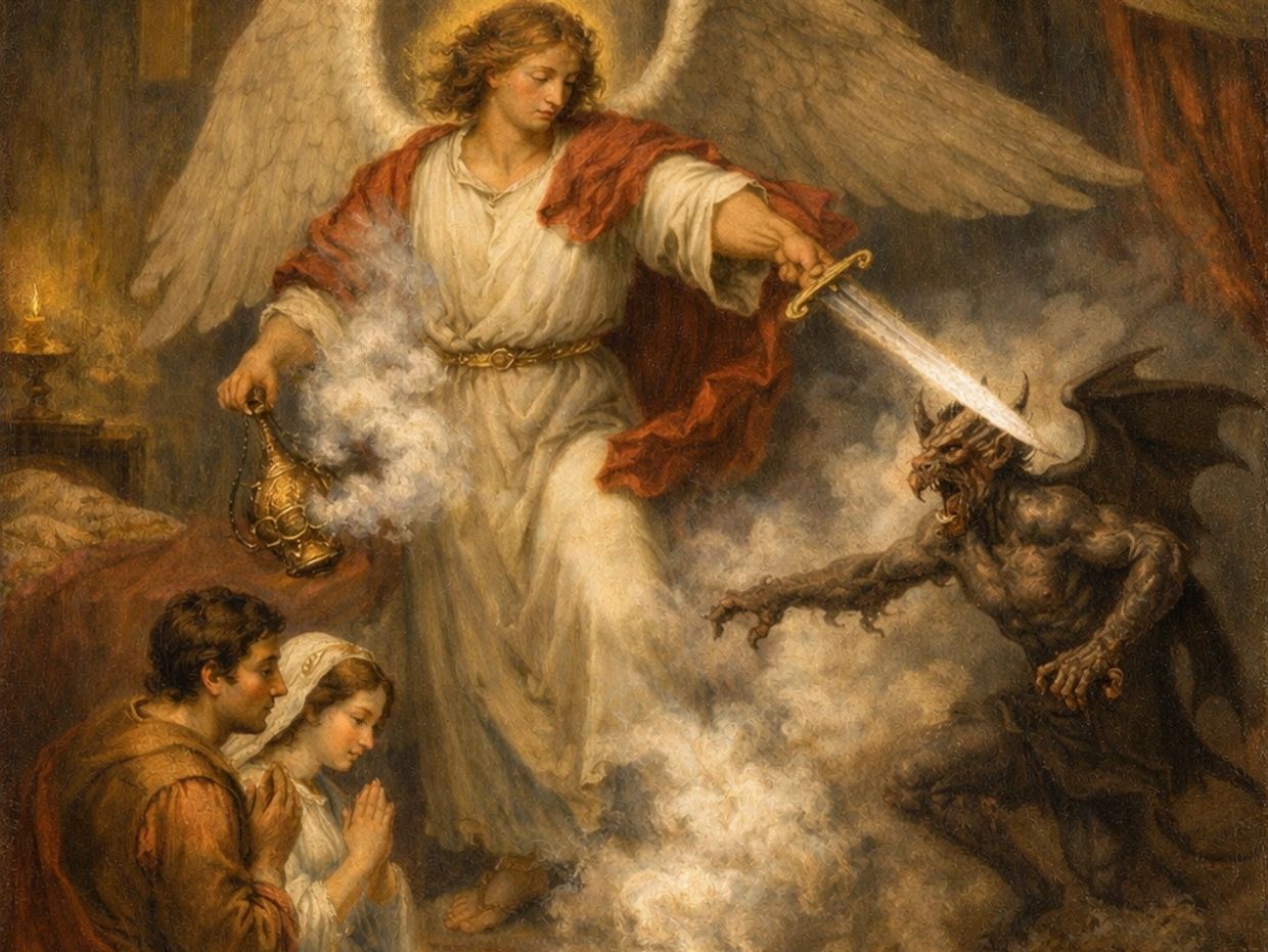 With the fish heart and liver, Tobias prays with Sarah, his betrothed, who is plagued by a demon in her bridal chamber (representing sexual-related trauma and violence). Through the prayers of the couple and the powerful assistance of St. Raphael, the demon is bound and their bridal chamber is cleansed and reconsecrated to God.